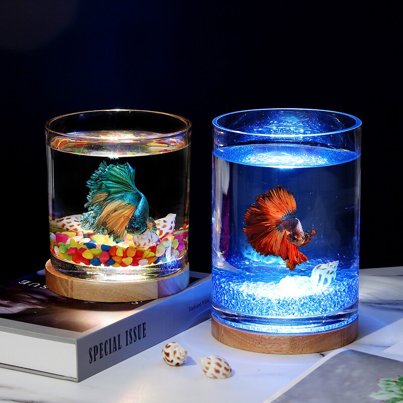 创意加厚玻璃鱼缸斗鱼孔雀鱼小型灯光迷你客厅桌面圆形办公室摆件热门设计联盟服务商
