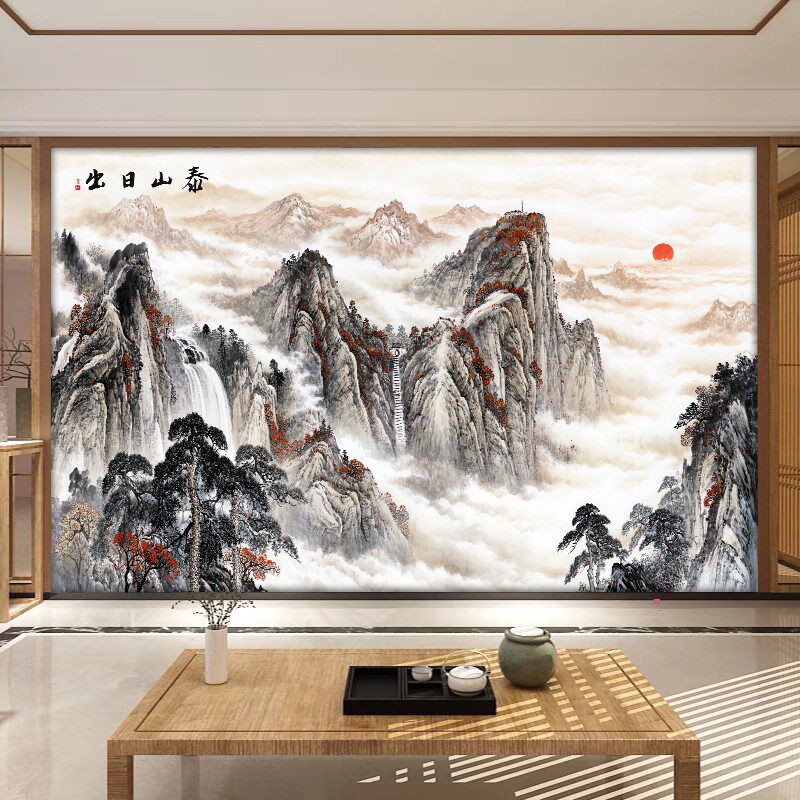 中式山水画客厅电视背景墙无缝墙布壁纸8d客厅影视5d墙纸国画壁画热门设计联盟服务商